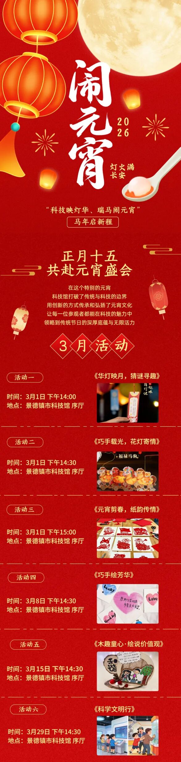 想在马年元宵留下独特回忆?快来参加“巧手裁光,花灯寄情”小马花灯手工活动!活动以简易模板拼接为主,零基础也能轻松上手。现场有展教老师细致讲解流程、分享窍门,全程贴心答疑。只需简单几步,就能把预制模板变成专属小马花灯,省时又有趣。活动老少皆宜,在动手中感受节日氛围,收获满满成就感。快来报名,定格这份美好!
